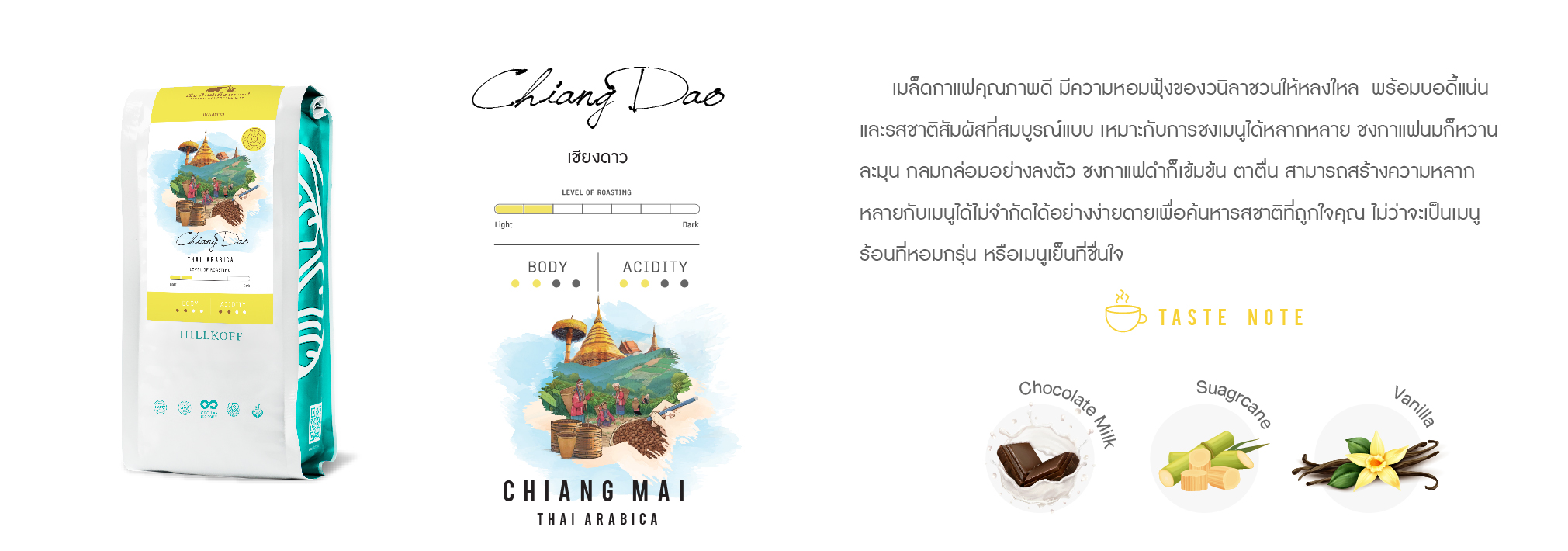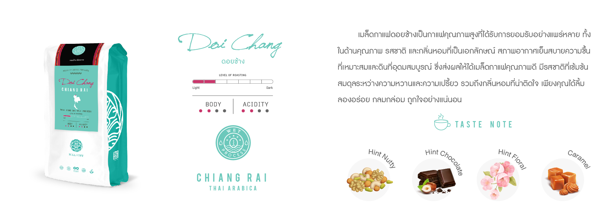 เมล็ดกาแฟคั่ว "ดอยช้าง" เชียงรายเป็นกาแฟที่มาจากสูตรลับของธรรมชาติ ด้วยความหอมละมุนของดอกไม้ เมื่อคุณชิมกาแฟสัมผัสกับรสชาติที่สมบูรณ์แบบ