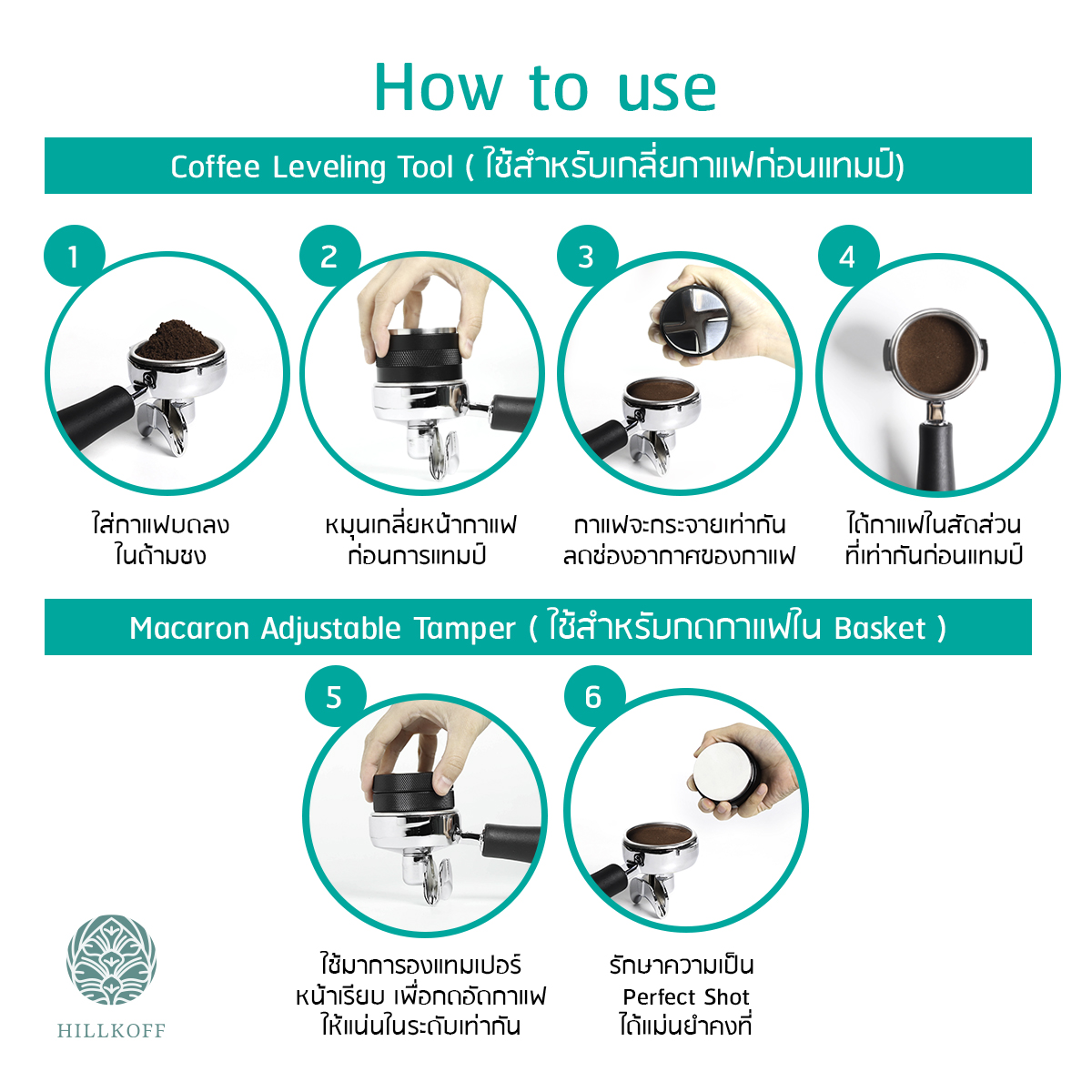 Macaron Adjustable Tamper ใช้สำหรับกดกาแฟใน Basket แบบหน้าเรียบ : มีลักษณะแบนราบ ช่วยทำให้ผงกาแฟมีหน้าเรียบเสมอกัน การใช้งาน สามารถปรับความลึกของการกดได้ และช่วยควบคุมน้ำหนักการกดให้คงที่