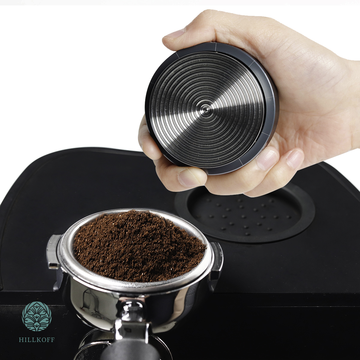 แบบวงก้นหอย : หน้าแทมเปอร์มีลักษณะผิวหน้าเป็นร่องคลื่นคล้ายก้นหอย ทำให้น้ำจากเครื่องชงกาแฟ ไหลผ่านผงกาแฟได้ทั่วถึง และช่วยถึงรสชาติกาแฟที่สกัดออกมาได้ดียิ่งขึ้น การใช้งาน สามารถปรับความลึกของการกดได้ และช่วยควบคุมน้ำหนักการกดให้คงที่