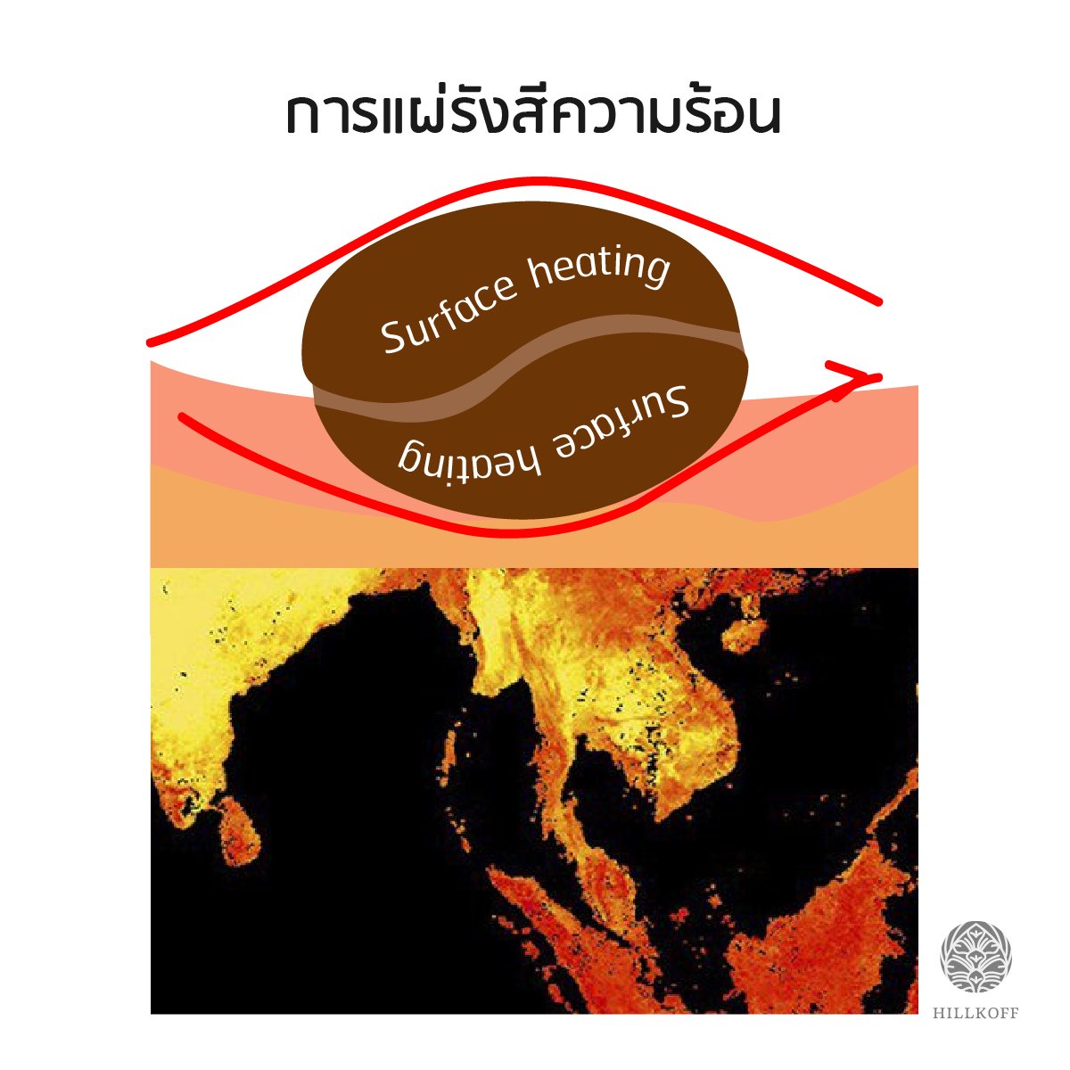 - สำหรับเมล็ดกาแฟผิวที่หยาบจะมีความสามารถในการดูดกลืนพลังงานจากการแผ่รังสีได้มากกว่าผิวเรียบ ฉะนั้นความสามารถในการดูดซับความร้อนของเมล็ดกาแฟเปลี่ยนแปลงตลอดเวลาที่คั่ว