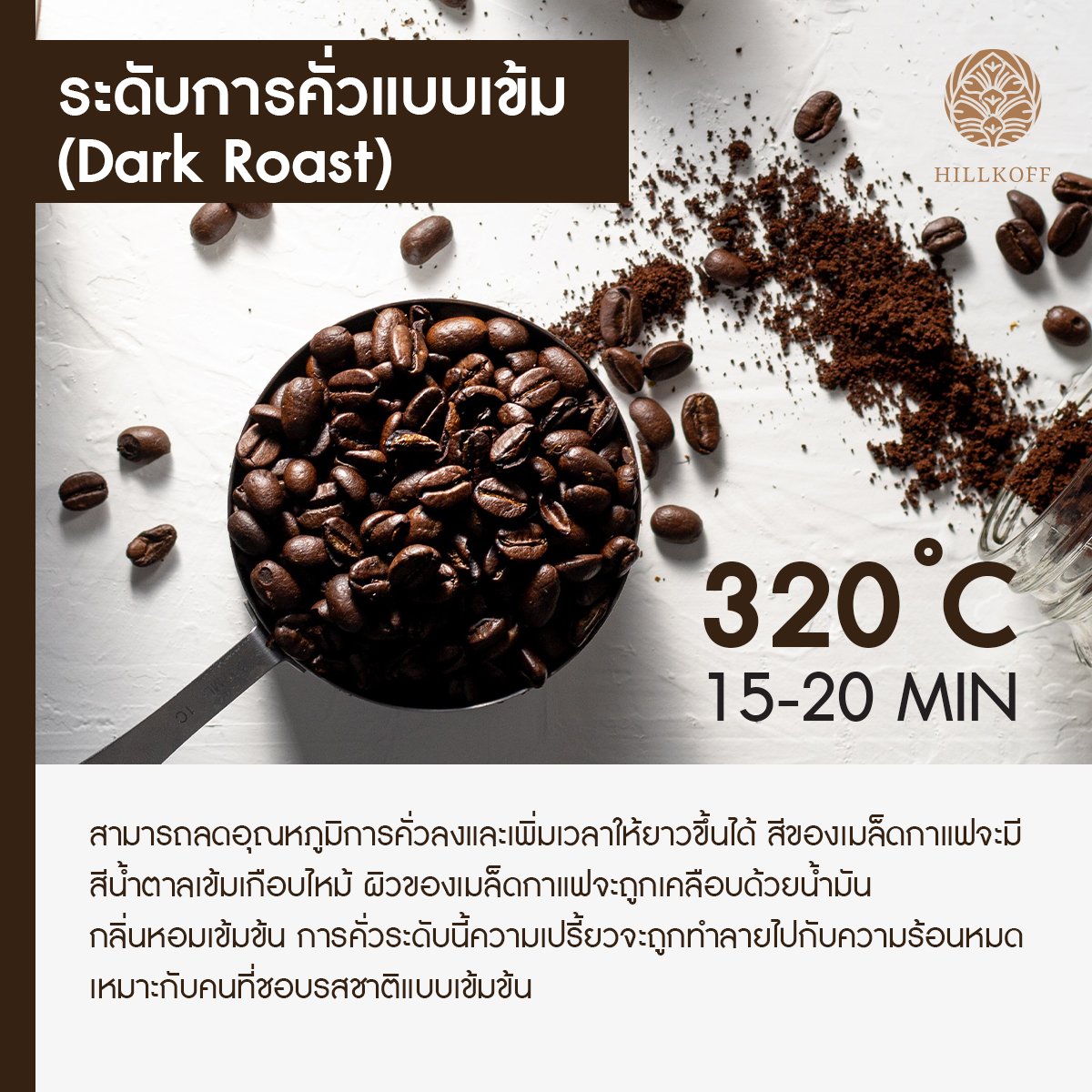 กาแฟระดับคั่วเข้ม คั่วอยู่ที่อุณหภูมิ 230c ใช้เวลาอยู่ในช่วง 15-20 นาทีเช่นกัน หรือสามารถลดอุณหภูมิการคั่วลงและเพิ่มเวลาให้ยาวขึ้นได้ สีของเมล็ดกาแฟจะมีสีน้ำตาลเข้มเกือบไหม้ ผิวของเมล็ดกาแฟจะถูกเคลือบด้วยน้ำมัน กลิ่นหอมเข้มข้น การคั่วระดับนี้ความเปรี้ยวจะถูกทำลายไปกับความร้อนหมด เหมาะกับคนที่ชอบรสชาตแบบเข้มข้น