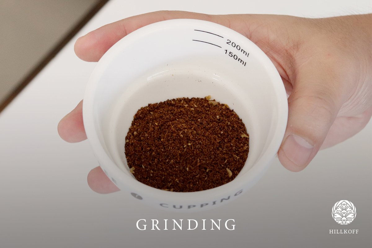ส่วนในการเตรียม Cupping กาแฟ Arabica นั้นตามอัตราส่วนของ Protocol มีอัตราส่วนกาแฟต่อน้ำอยู่ที่ 8.25 g : 150 ml หรือ กาแฟ 11 g ต่อน้ำ 200 ml ซึ่งในการ Cupping นั้น 1 ตัวอย่างกาแฟ จะแยกออกเป็น 3-5 ถ้วย เพื่อทบสอบความแต่งที่มีในก าแฟจากแหล่งเดียวกัน จะทำให้รู้ถึงความแตกต่างที่สามารถโยงไปถึงวิธีการดูแล ของเกษตรว่ามีคุณภาพหรือไม่ การบดกาแฟ Cupping จะบดให้มีขนาดใกล้เคียงกับน้ำตาลทรายแดงโดยใช้การสังเกตเพราะเบอร์บดของเครื่องบดแต่ละรุ่นจะมีขนาดไม่เท่ากันจึงไม่สามารถกำหนดเบอร์ ที่ตายตัวได้หรือขนาดจากการ บด 70 – 75% ผ่านตระแกรงร่อนขนาดเบอร์ 20 US Mesh หลังจากการบดกาแฟเตรียมแต่ละถ้วยแล้วควรปิดหน้าถ้วยให้ สนิทก่อนเมื่อเตรียมครบถ้วย แล้วให้เปิดในช่วงเริ่มทำการ Cupping เพื่อไม่ให้กลิ่นหายไป และกาแฟที่บดแล้วควรเริ่มดม กลิ่นในช่วงเวลาไม่เกิน 15นาที