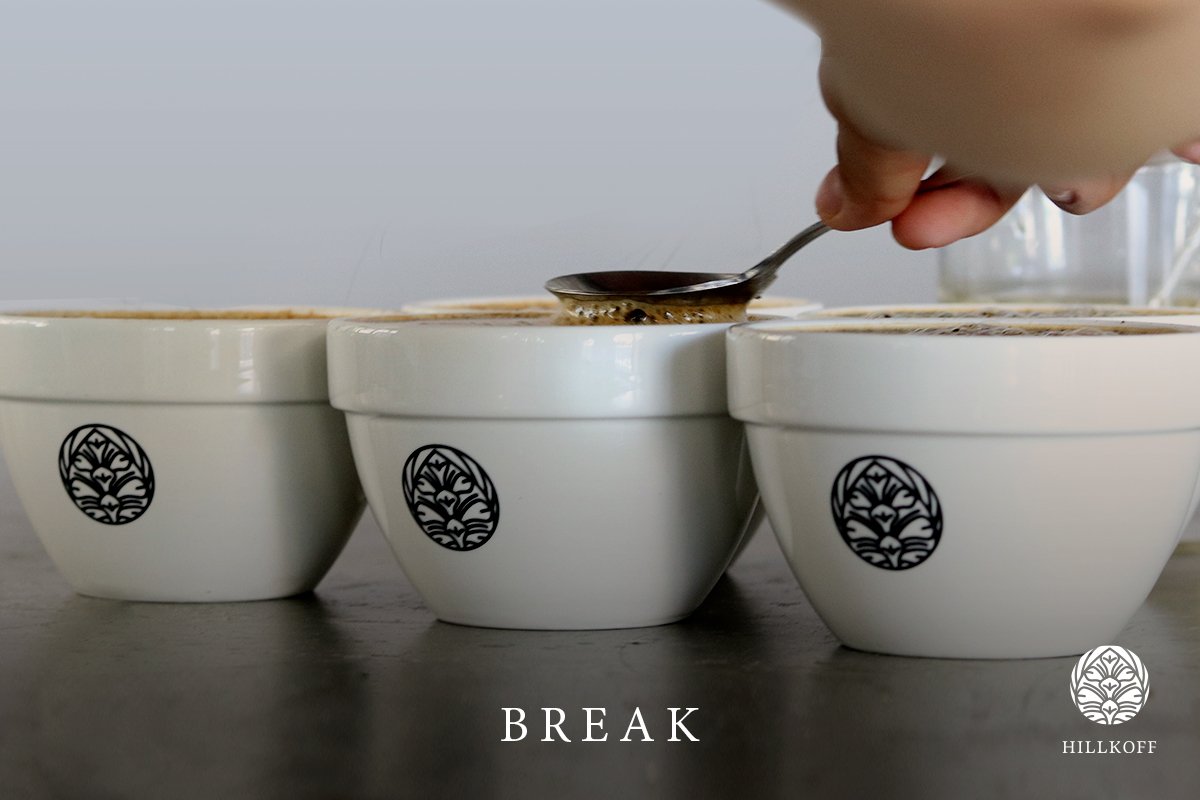 จากนั้นรอประมาณ 5 นาที เมื่อครบเวลาแล้วจะทำการ Break ผิวหน้ากาแฟ คือการนำใต้ช้อนปัดที่ผิวหน้ากาแฟประมาณ 3ครั้ง แล้วดมกลิ่นว่าได้สัมผัสกลิ่นอะไรและแตกต่างกับตอนที่แห้งไปในลักษณะไหนบ้าง