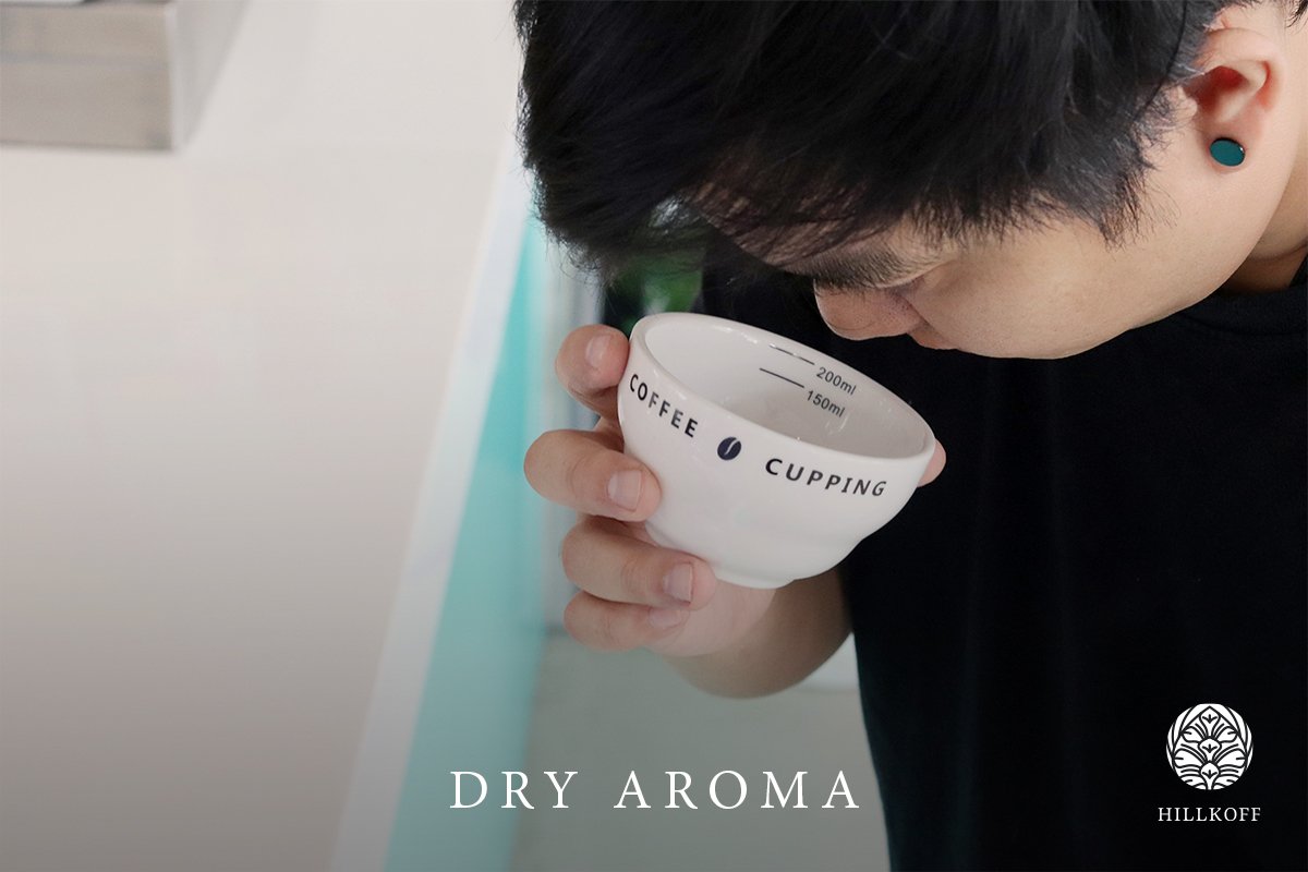 หลังจากเตรียมกาแฟเพื่อทำการ Cupping พร้อมแล้ว จะเริ่ม Cupping ด้วยการ Dry Aroma เป็นการเริ่มดมกลิ่น Aroma ของกาแฟตอนแห้ง เพื่อให้รับรู้ถึงรูปแบบกลิ่นของตัวเมล็ดว่าไปทางโทนกล ิ่นที่ดีมีความหอมแบบไหน เช่นสมุนไพร น้ำผึ้ง ถั่ว ฯลฯ หรือกลิ่นที่ไม่พึงประสงค์ เช่น กลิ่นสารเคมี ที่อยู่ในตัวกาแฟ