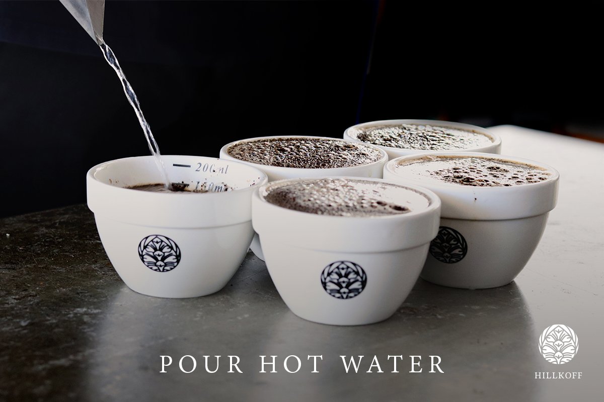 จากนั้นเริ่มเติมน้ำร้อน ใช้น้ำร้อนที่อุณหภูมิ 92-94 ° C เติมลงถ้วย Cupping 200 ml