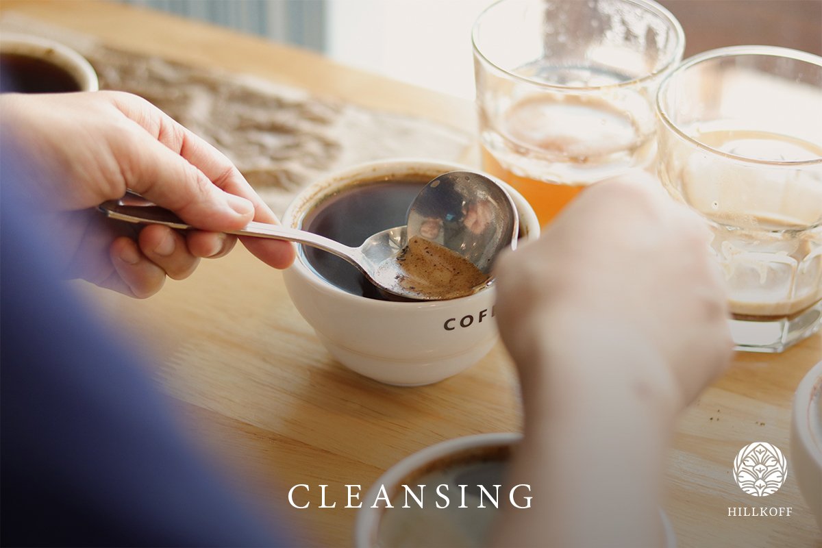 หลังจากนั้น Cleansing คือตักผิวหน้าของผงกาแฟที่ลอยอยู่เบาๆ ด้วยการตักแบบวนจากกลางถ้วย ออกมา วิธีการเหมือนการตักผิวหน้า ซุป ปกติแล้วเราตักให้หมดภายใน 3 ครั้ง (ระวังอย่าให้ผงกาแฟที่จมอยู่ตีขึ้นมาเพราะจะทำให้การชิมอาจมีกากผงกาแฟติดมาด้วยยากต่อการทดสอบ) หลังจากขั้นตอนนี้จะทิ้งไว้ รออีก 5 นาที เพื่อให้ตัวน้ำกาแฟลดอุณหภูมิลงก่อนแล้วเริ่มการทดสอบ Slurp หรือ ซูดชิมกาแฟนั่นเอง