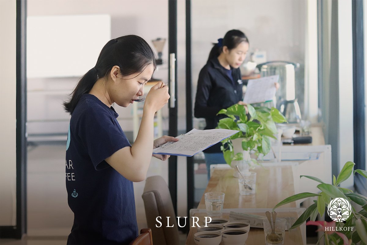 การ Slurp เข้าไปเพื่อให้รสชาติกระจายทั่วปาก เราจะอมไว้ 3 วินาที ช่วงนี้ให้เช็คดูว่าเราได้ Acidity หรือกรดความเปรี้ยวของกาแฟที่ไปทางรสชาติของผลไม้ แบบไหนบ้าง มีความ Balance ความสมดุลในแบบไม่เปรี้ยวหรือหวานเกินไป ได้ในส่วนของ Body การให้ความรู้สึกหนักเบาของ กาแฟมากน้อยแค่ไหน และค่อยๆกลืนลงไปผ่านลำคอให้สังเกต aftertastes ว่ามีอะไรคงค้างอยู่บ้าง การชิมจะทำการชิมทั้งช่วงที่มีกาแฟยังความร้อนและช่วงเย็นที่กาแฟอุณภูมิลดลงเพราะ จะทำให้เราได้รสชาติและ Character ที่ต่างกัน