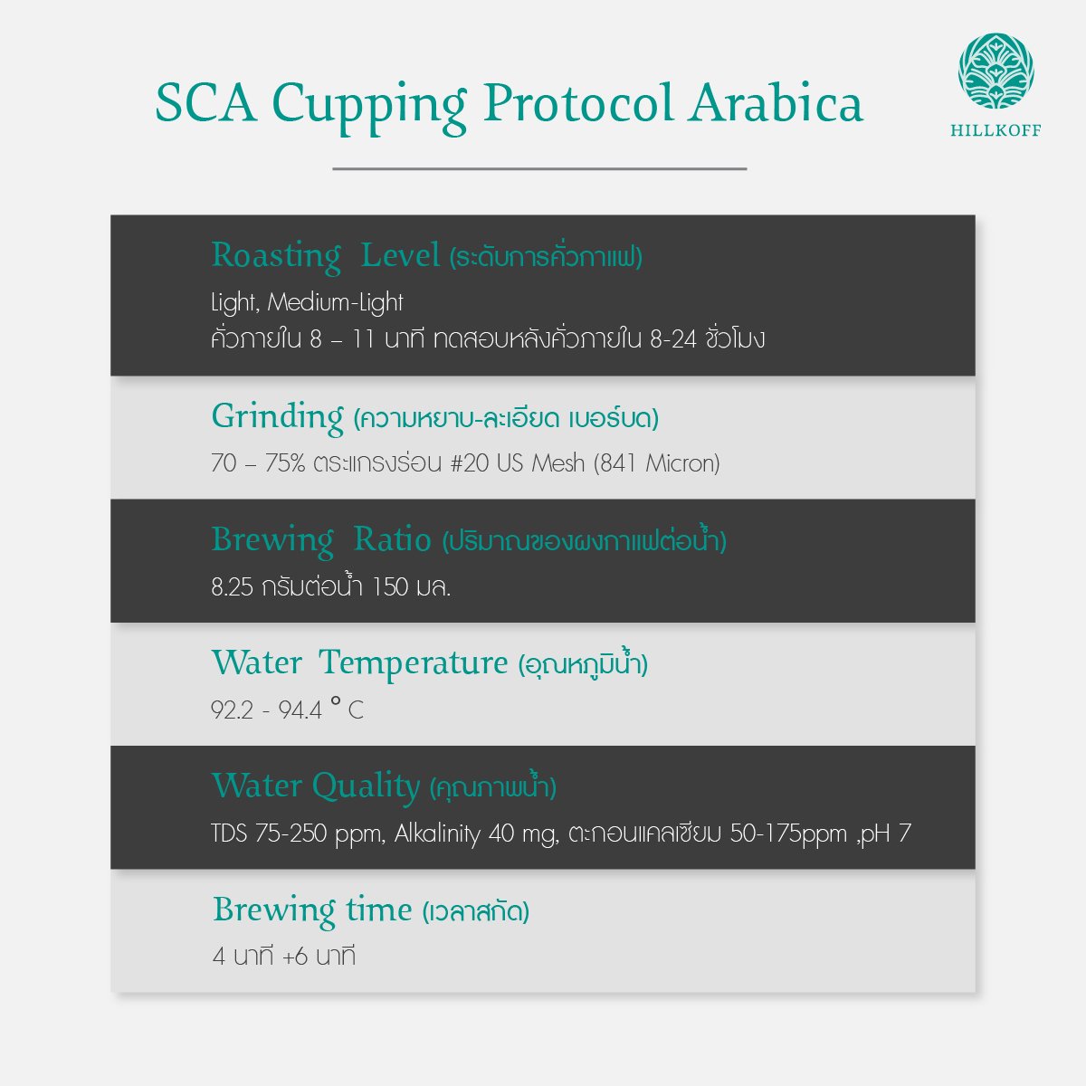 SCA (The Specialty Coffee Association) จึงได้ออกแบบวิธีการ Cupping ให้มีมาตรฐานเดียวกันเพื่อทดสอบกาแฟ (Cupping Protocol) ซึ่งจะครอบคลุมตั้งแต่การคั่วกาแฟ ไปจนถึงการชงกาแฟ ทำให้เราสามารถบอกได้ว่าความแตกต่างของรสชาติและ Character ที่เกิดนั้นมาจากตัวของเมล็ดกาแฟเอง