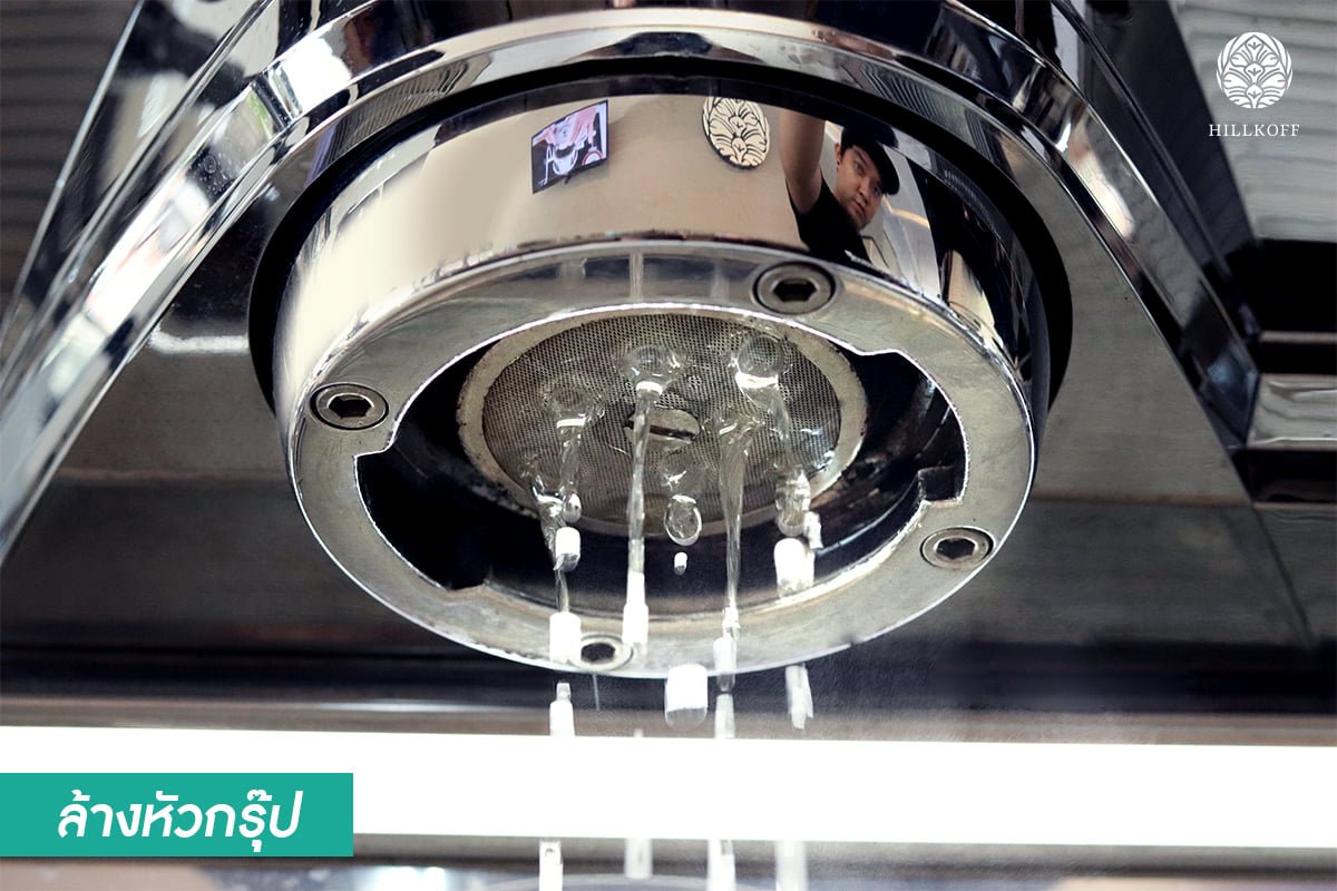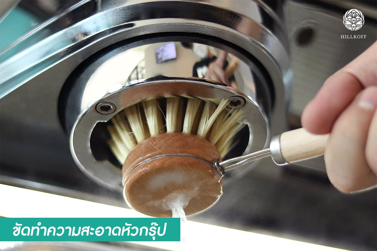 ใช้แปรงขัดหัวกรุ๊ป(แปรงที่มีลักษณ์ขนที่อ่อน)ขัดให้รอบตามมุมขอบต่างๆด้านใน (ไม่ควรใช้แปรงที่มีขนแข็งเพราะจะทำเกิดความเสียหายกับ ยางโอริงหรือหัวชงอาจเกิดรอยได้)