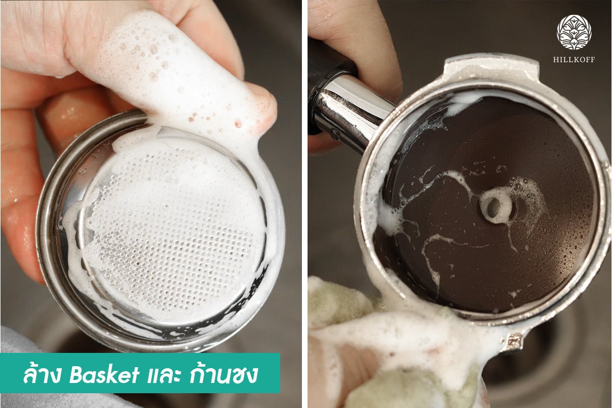 ในส่วนของก้านชง และ Basket นั้นในแต่ละวันที่ใช้งานจะมีส่วนของคราบกาแฟอยู่อย่างแน่นอนหากเราไม่ทำความสะอาด คราบกาแฟก็จะติดอยู่และส่งผลต่อคุณภาพกาแฟที่สกัดมาเช่นกัน วิธีการล้างง่ายๆ แค่ถอดBasketออกจากก้านชงและล้างด้วยน้ำยาล้างจาน ตามด้วยล้างน้ำเปล่าให้สะอาด หรืออีกวิธีที่แสนง่ายด้วยการน้ำไปแช่ผงช่วยทำความสะอา ด Kofex โดยการนำน้ำร้อน 500 cc ใส่ภาชนะที่มีขนาดพอเหมาะกับก้านชงและ Basket จากนั้นใส่ผง Kofex ปลายช้อนชาลงไป นำก้านชงและ Basket แช่ทิ้งไว้ 30 นาที เมื่อครบเวลานำมาล้างน้ำสะอาดและเช็ดให้แห้ง