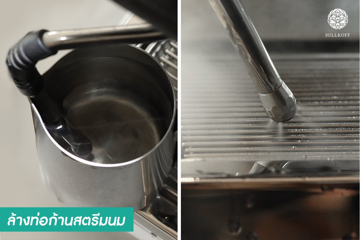 ท่อก้านสตรีมนมหากเราทิ้งไว ้ไม่ได้ทำความสะอาด จะทำให้เกิดคราบนมติดอยู่ซึ่งอาจจะเป็นที่มาของเชื้อโรคได้ อาจเกิดการเน่าเสียของนมที่ ติดอยู่ปลายท่อสตรีมและในบางครั้งเจ้าหนูอาจเข้าไป กัดแถะในส่วนนี้อีกด้วย ดังนั้นอย่ามองข้ามส่วนเล็ก ๆนี้ไป วิธีทำความสะอาดนั้นแสนง่าย  เพียงแค่เราเตรียมน้ำสะอาดในพีชเชอร์ขนาดกลางประมาณครึ่งหนึ่ง จากนั้นให้นำไปแช่ในส่วนของหัวท่อก้านสตรีมนม เปิดท่อสตรีมให้น้ำในพีชเชอร์ร้อนจนเดือด ปิดท่อสตรีม แช่หัวท่อก้านสตรีมนมไว้ 3 นาที จากนั้นนำพีชเชอร์ออก หมุนท่อสตรีมให้ต่อสตรีมระบายน้ำที่ขังด้านในท่อก้านสตรีมนมออก เช็ดด้วยผ้าสะอาดก็เป็นอันเรียบร้อย