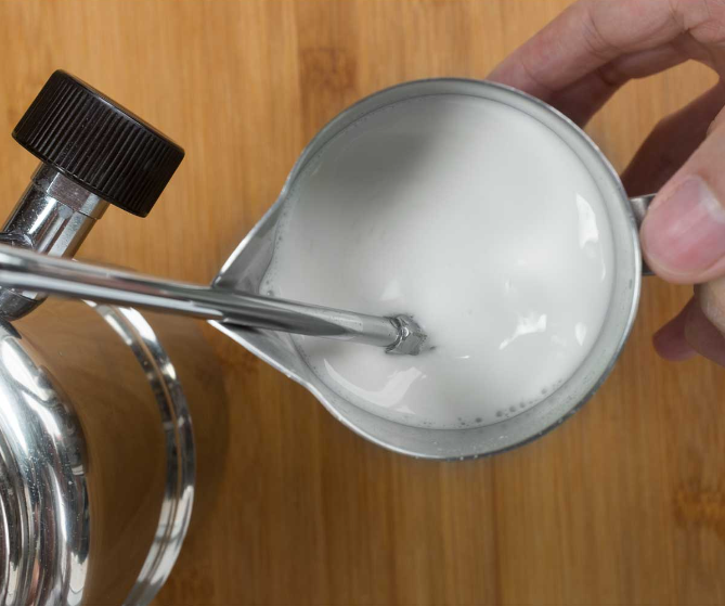 The more you move the pitcher down that more milk foam will be added. In each steam, we have to observe the increase of the foam to be suitable for use and if we see the level of milk foam increased as needed, stop moving and watch the froth until smooth and shiny.