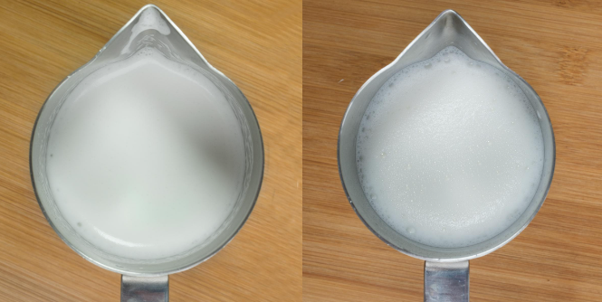 To make the good stream, we don't want the thick milk foam. The Good milk froth will have a smoothness as Micro foam level or small bubbles. Milk typically contains about 4-5% fat, a small, dense molecule and when all the fat in the milk is heated and dissolved into liquid, The protein in milk will bind to the surface of the air bubbles. Causing coagulation and forming milk foam