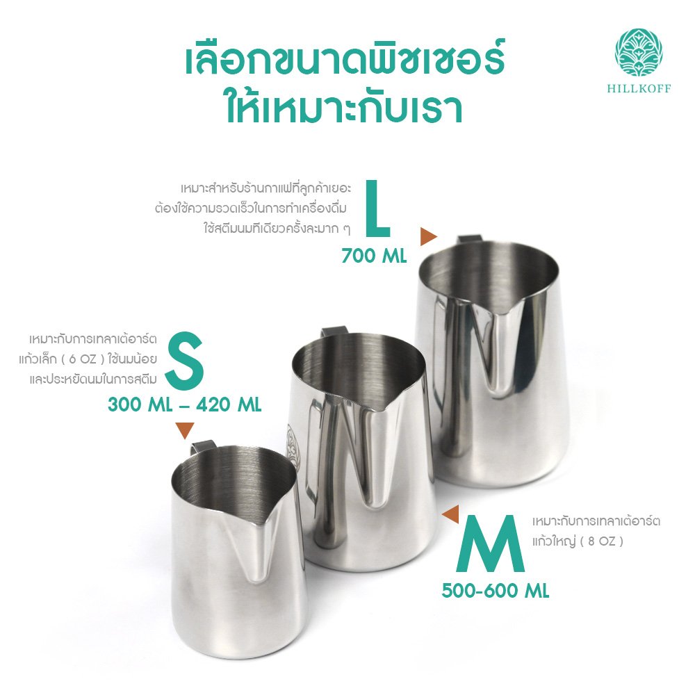 · เหยือกขนาด 700 ML ขึ้นไปเหมาะสำหรับร้านกาแฟที่ลูกค้าเยอะต้องใช้ความรวดเร็วในการทำเครื่องดื่ม ใช้สตรีมนมทีเดียวครั้งละมากๆเพื่อเทลาเต้อาร์ตหลายแก้ว