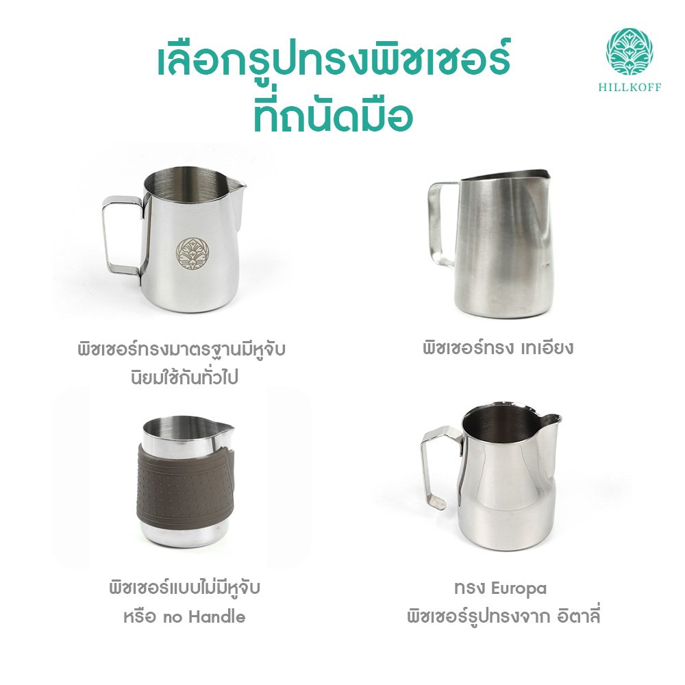 · พิชเชอร์ทรงมาตรฐาน มีหูจับ นิยมใช้กันทั่วไป เทลายลาเต้อาร์ตได้อย่างหลากหลาย เทได้ทั้งลาย Basic และลาย Advanced สามารถควบคุมพิชเชอร์ได้ทั้งการสะบัดและเดินหน้าถอยหลังได้อย่างดี