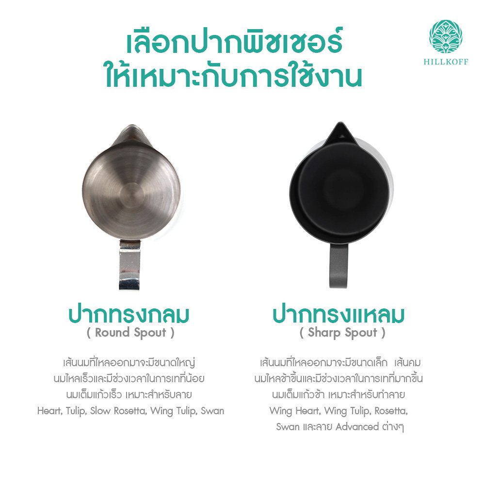 · ปากทรงแหลม ( Sharp Spout ) เส้นนมที่ไหลออกมาจะมีขนาดเล็ก เส้นคม นมไหลช้าขึ้นและมีช่วงเวลาในการเทที่มากขึ้น นมเต็มแก้วช้า เหมาะสำหรับทำลาย Wing Heart, Wing Tulip, Rosetta, Swan และลาย Advanced ต่างๆ