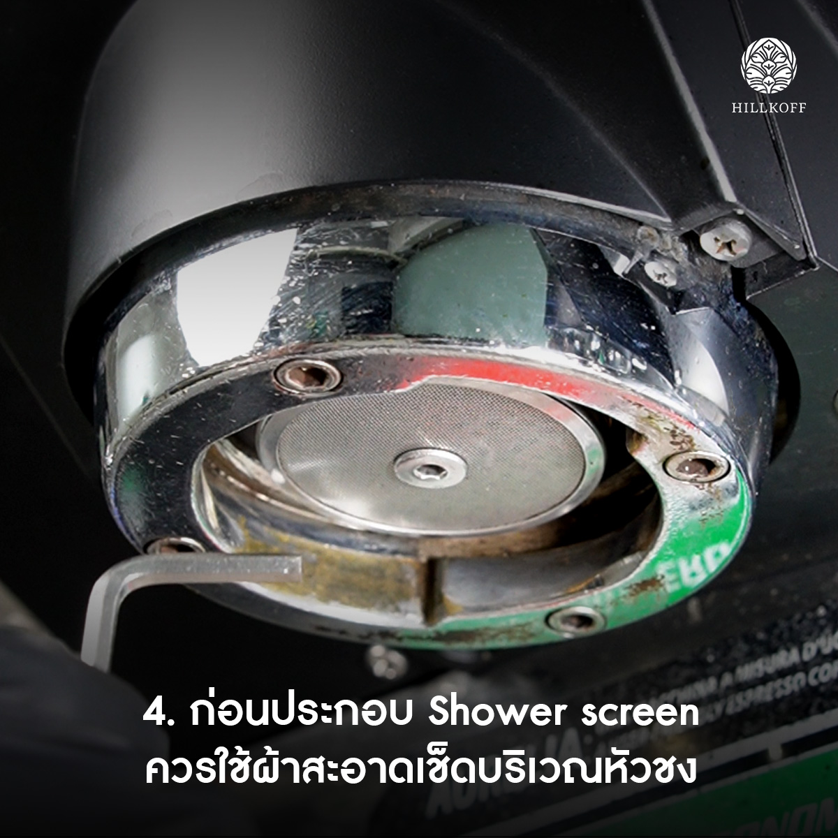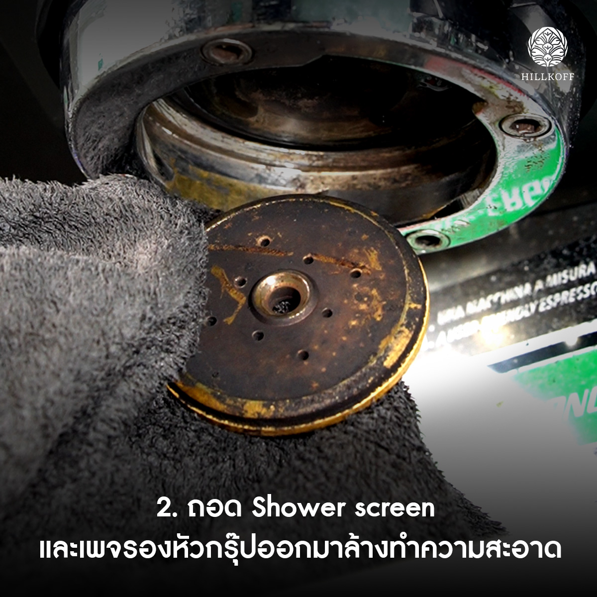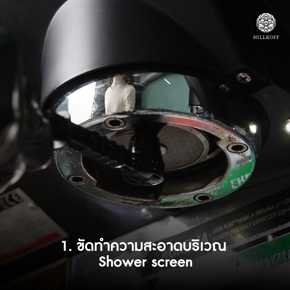 ใช้ผ้าสะอาดชุบน้ำบิดหมาดๆ เช็ดบริเวณ Shower screen และขอบด้านข้าง หลังจากนั้นถอด Shower screen และเพจรองหัวกรุ๊ปออกมาล้างทำความสะอาด หากมีคราบกาแฟ ผงกาแฟติดแน่นฝังลึก ให้แช่ด้วย Kofex หรือผงล้างทำความสะอาดเครื่องชงก่อน แล้วค่อยนำไปล้างทำความสะอาดต่อ
