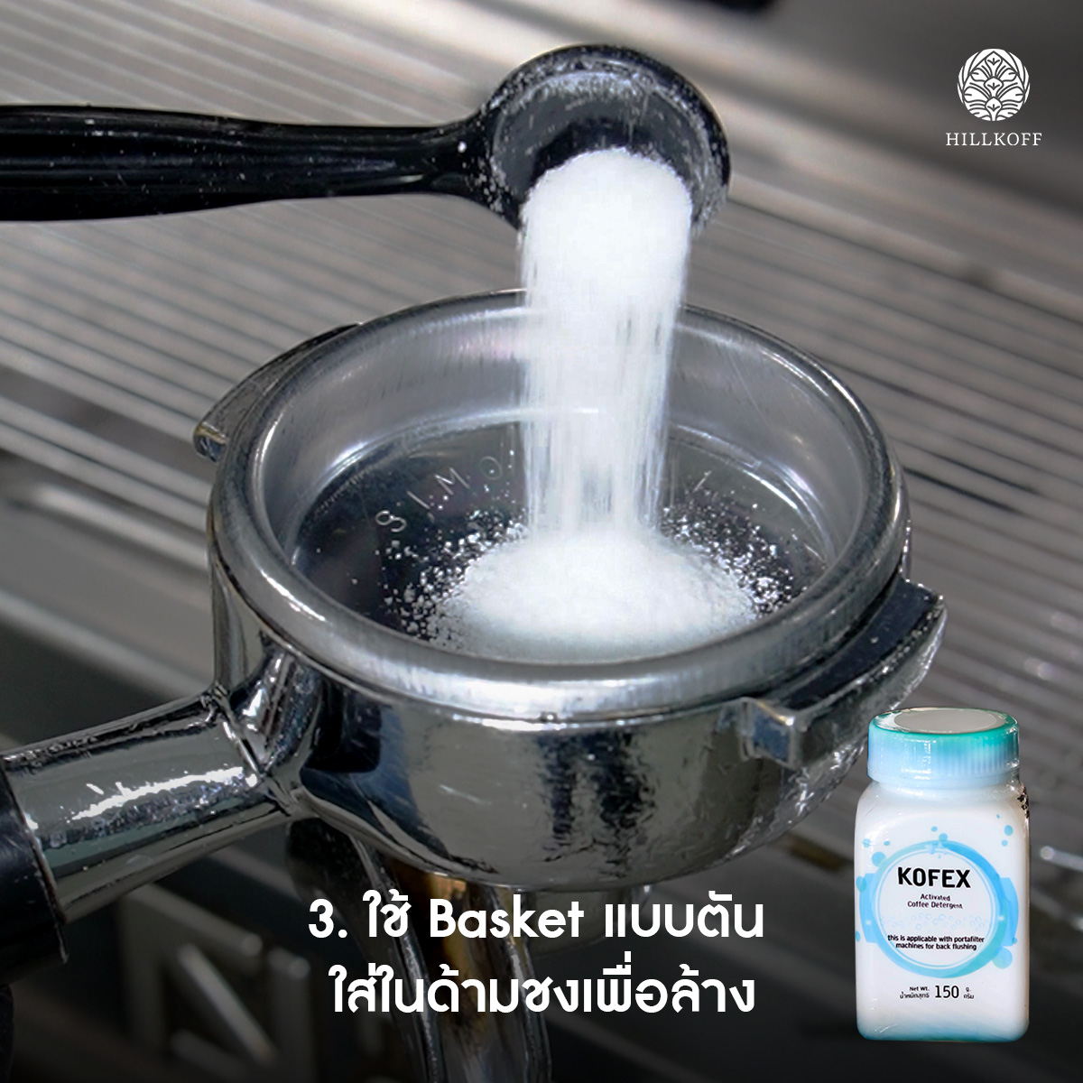 ใช้ Basket แบบตัน ใส่ในด้ามชง จากนั้นใส่ผง Kofex หรือผงล้างทำความสะอาดเครื่องชง ลงไป ประมาณ ครึ่งช้อนชา หรือ 1 ช้อนชา จากนั้นใส่ด้ามชงเข้ากับหัวชงแล้วเริ่มกดทำความสะอาด
