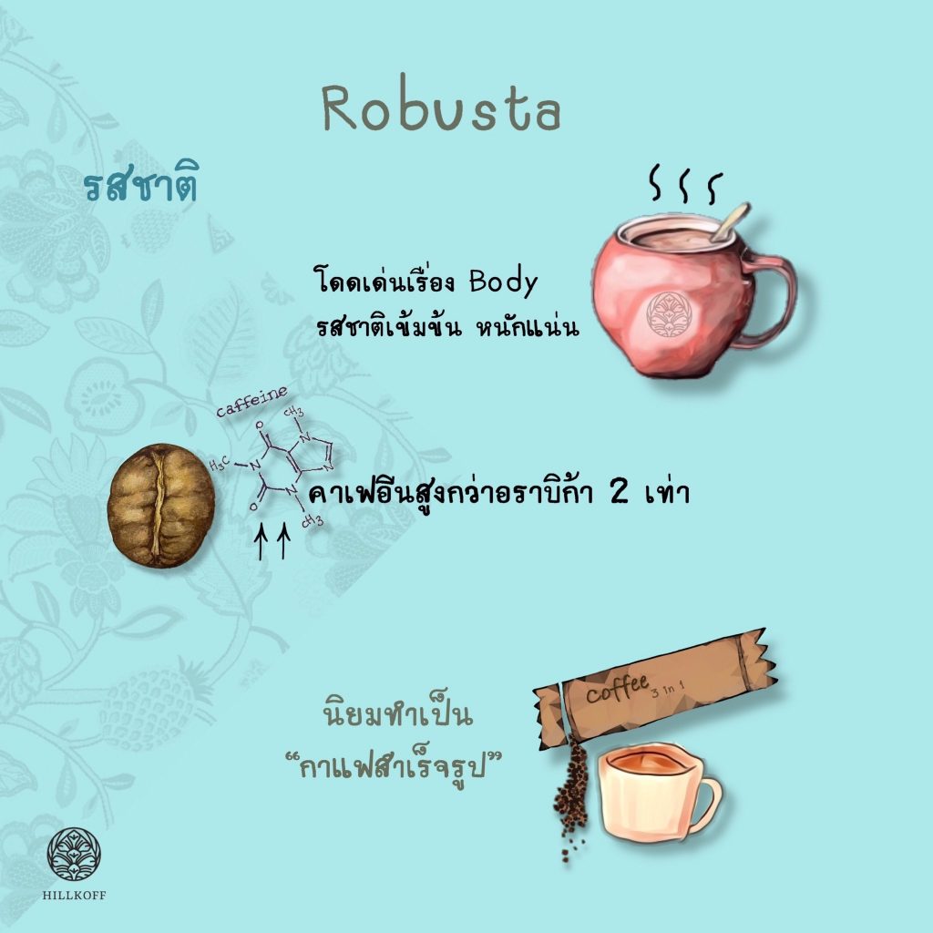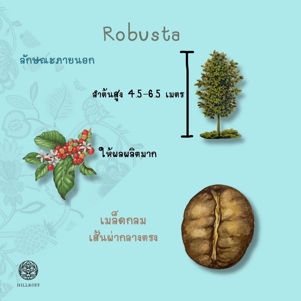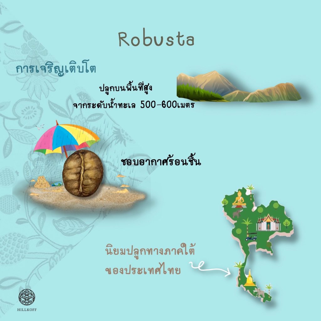 กาแฟชนิดโรบัสต้า (Robusta) กาแฟชนิดโรบัสต้านั้นปลูกทางภาคใต้ เพราะภาคใต้ของประเทศไทยมีสภาพอากาศร้อนชื้นที่เหมาะแก่การเจริญเติบโต โรบัสต้านั้นมีความโดดเด่นด้าน Body เวลาดื่มจะรู้สึกได้ถึงความเข้มข้น หนักแน่น มีปริมาณคาเฟอีนสูงเป็นสองเท่าของอราบิก้า แต่ความหอมสู้อราบิก้าไม่ได้ นิยมนำไปทำเป็นกาแฟพร้อมชง (instant coffee) และพร้อมดื่มบรรจุกระป๋อง บรรจุขวด หรือกล่อง