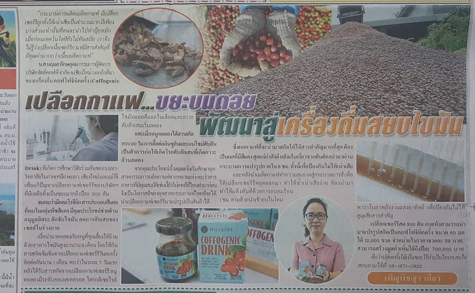“กระบวนการผลิตเมล็ดกาแฟ มีเปลือกเชอร์รีถูกทิ้งให้เน่าเสียเป็นจำนวนมาก มีเพียงบางส่วนเท่านั้นที่คนจะนำไปทำปุ๋ยหมัก เมื่อก่อนเทคโนโลยียังไม่ทันสมัย เราจึงไม่รู้ว่าเปลือกเนื้อเชอร์รีกาแฟมีสารสำคัญที่มีคุณค่ามากกว่าเนื้อเมล็ดกาแฟ” น.ส.นฤมล ทักษอุดม กรรมการผู้จัดการ บริษัท ฮิลล์คอฟฟ์ จำกัด จ.เชียงใหม่ บอกถึงที่มาของเครื่องดื่ม คอฟโฟจินิคดริ้ง (Coffogenic Drink) ที่เกิดการศึกษาวิจัยร่วมกันของ 3 มหาวิทยาลัยในภาคเหนือ พะเยา, เชียงใหม่ และแม่โจ้ เพื่อแก้ปัญหาเปลือกกาแฟเชอร์รีของบริษัทฯ ที่มีเหลือทิ้งเป็นขยะมากถึงปีละ 300 ตัน