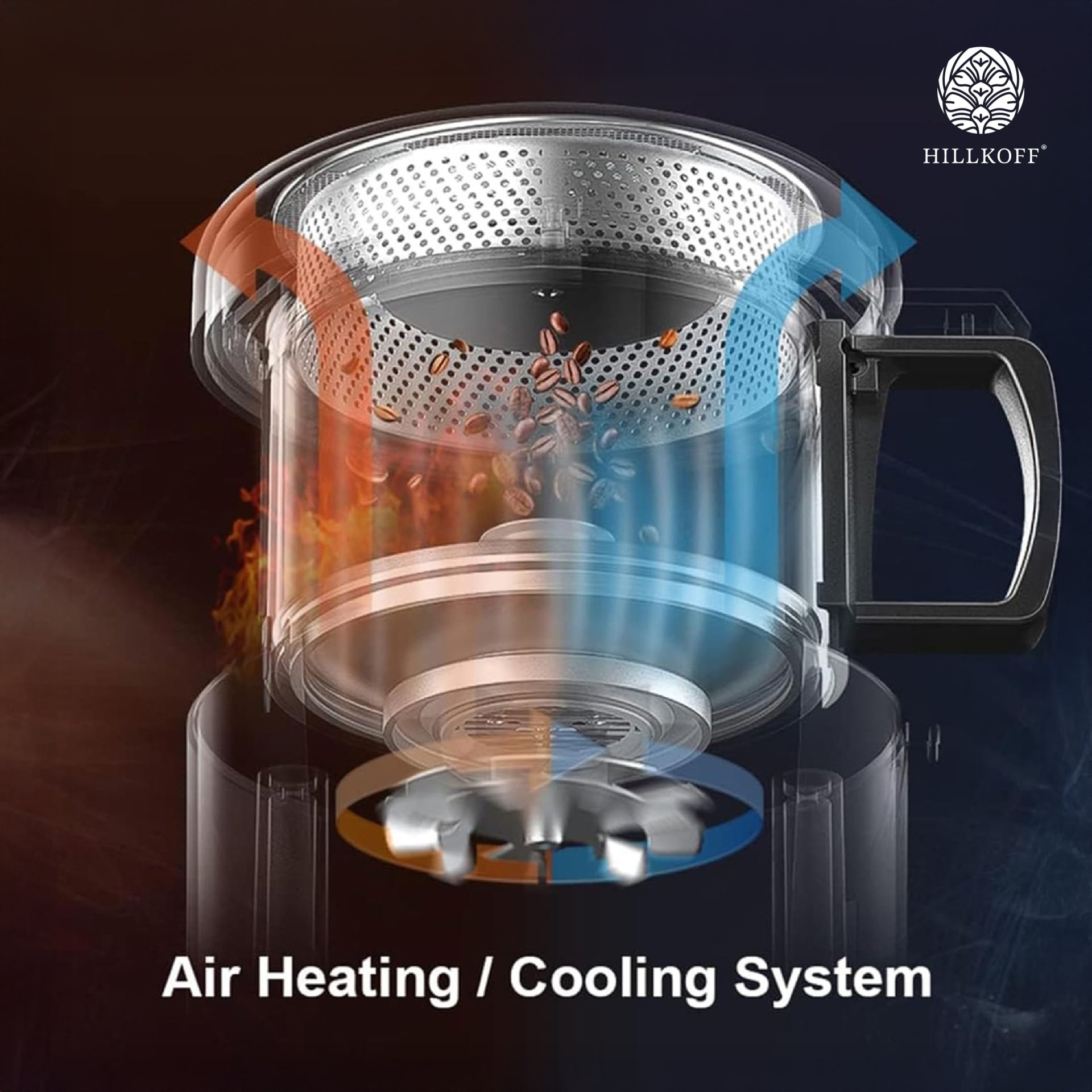 คั่วและทำความเย็นในหม้อเดียว ด้วยระบบลมร้อนและลมเย็นในทิศทางสวนกัน ช่วยควบคุมการคั่วให้เสถียร ป้องกันเมล็ดกาแฟไหม้ และคงความหอมของกาแฟอย่างเต็มที่