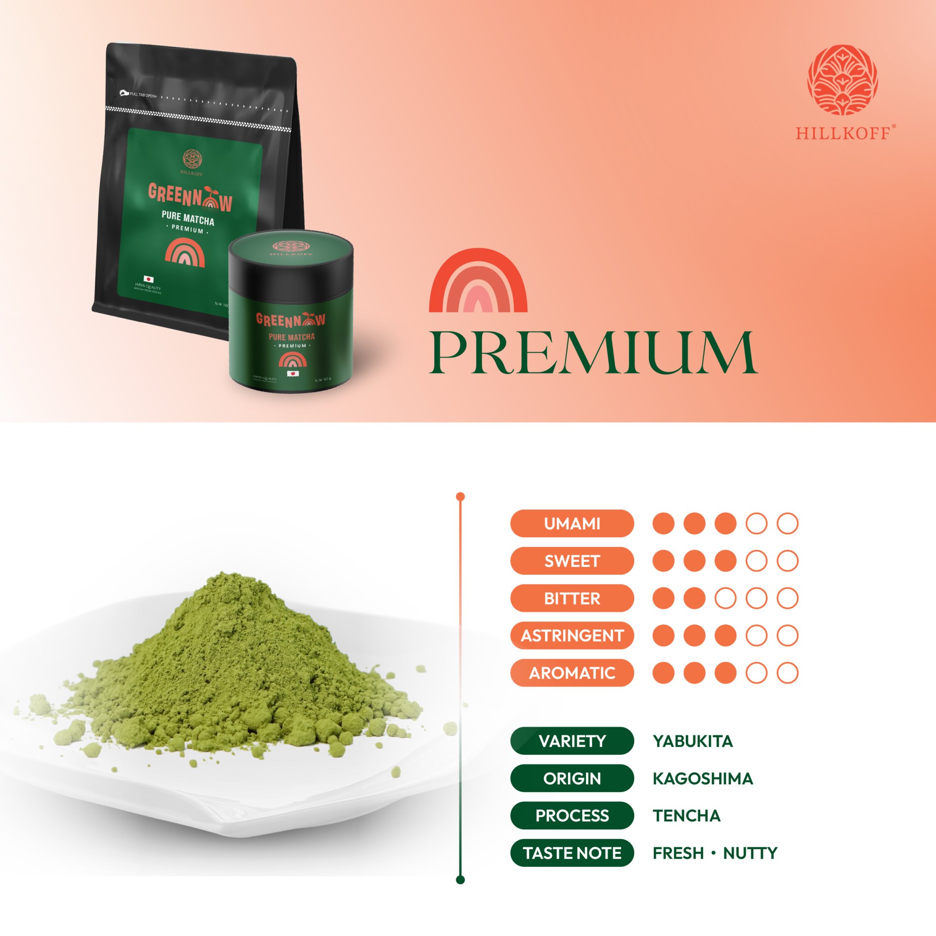 มัทฉะแท้เกรดพรีเมียม นำเข้าจากญี่ปุ่น ผลิตจากยอดใบชาอ่อนสายพันธุ์ Yabukita ปลูกในจังหวัด Kagoshima ที่ได้รับการดูแลอย่างพิถีพิถัน
