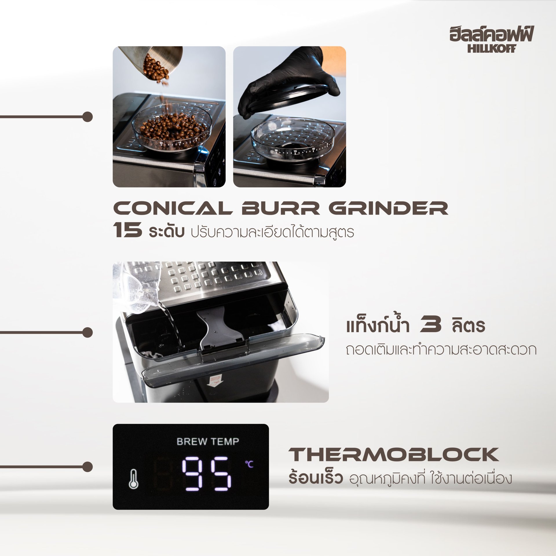 • แท็งก์น้ำความจุ 3 ลิตร ถอดเติมได้ง่าย ทำความสะอาดสะดวก รองรับการชงต่อเนื่องหลายแก้ว
