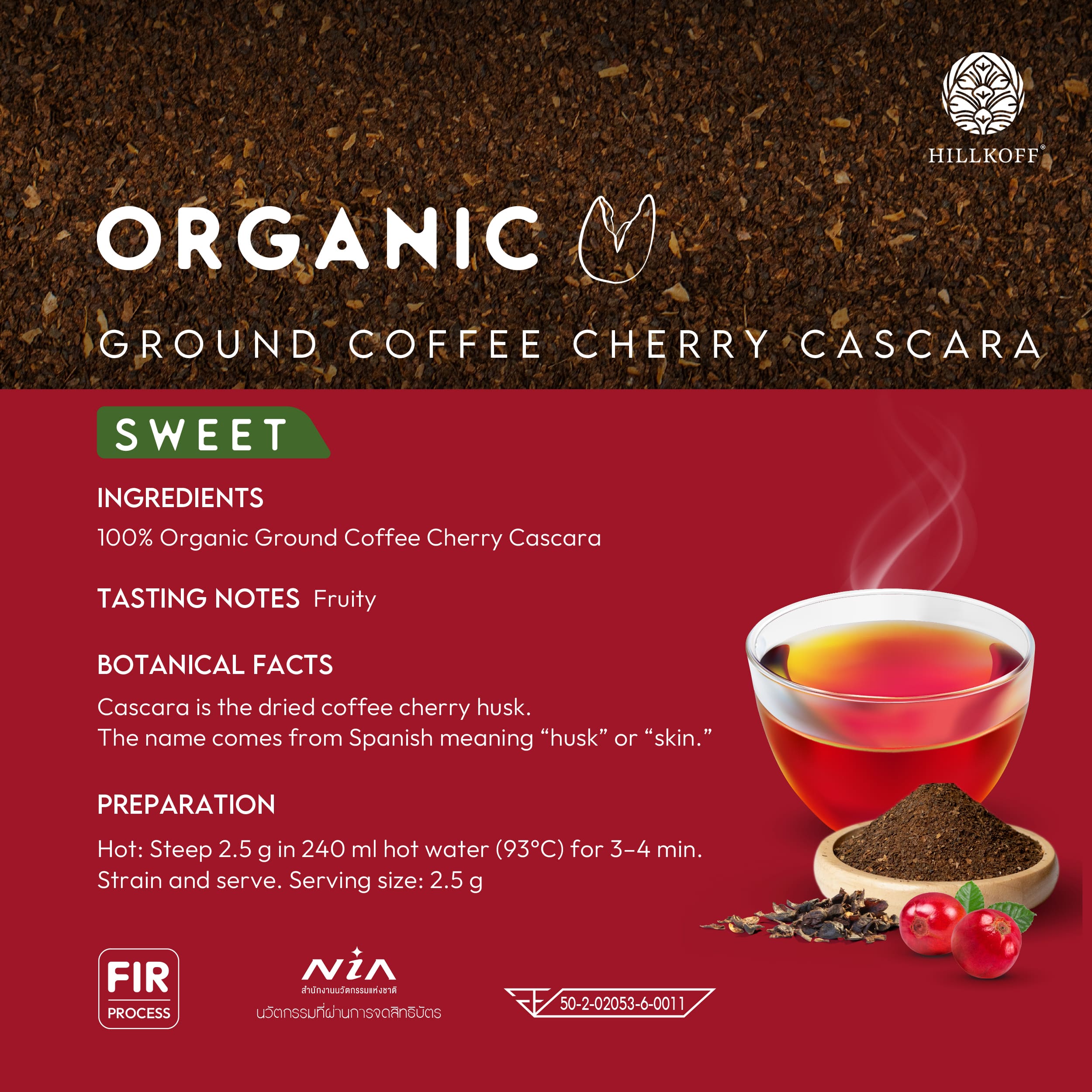 เป็นการนำส่วนเนื้อของผลกาแฟที่ผ่านการคัดสรรอย่างพิถีพิถัน มาทำให้แห้งผ่านกระบวนการผลิต FIR Process เพื่อคงคุณค่าธรรมชาติ แล้วนำมาชงเป็นชา กลายเป็นอีกหนึ่งเครื่องดื่มที่ทั้งคอกาแฟและคนรักชาต่างเริ่มหลงรัก