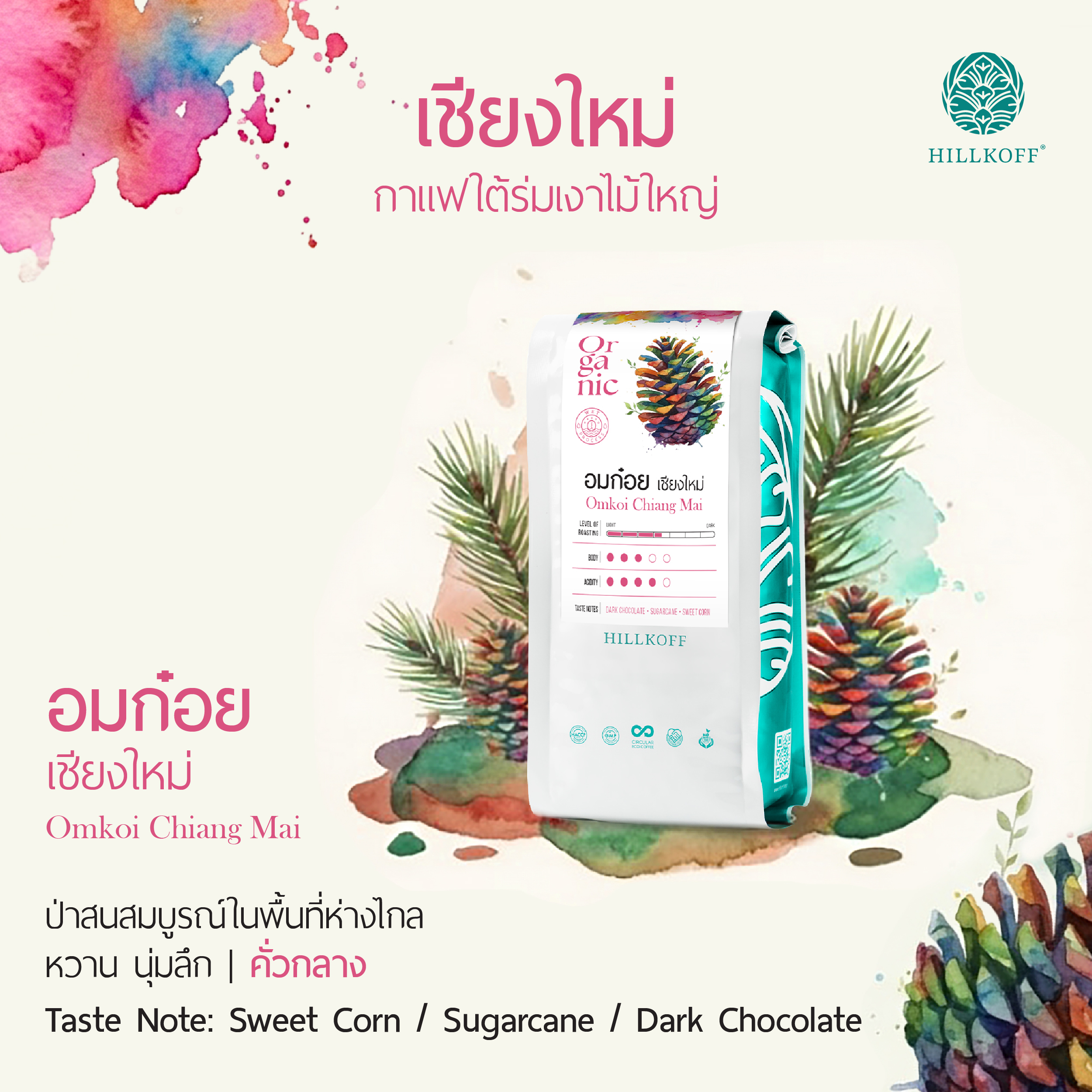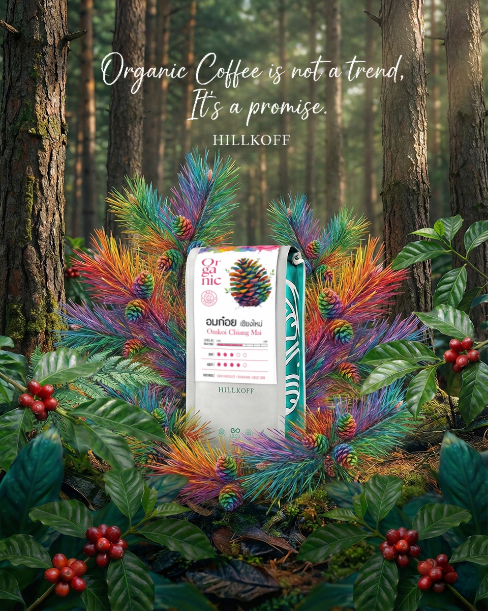 เมล็ดกาแฟออร์แกนิกจากแหล่งปลูกอมก๋อย ที่ยังคงความอุดมสมบูรณ์ของผืนป่าและวิถีปลูกใต้ร่มไม้ ส่งต่อรสชาติที่เป็นเอกลักษณ์