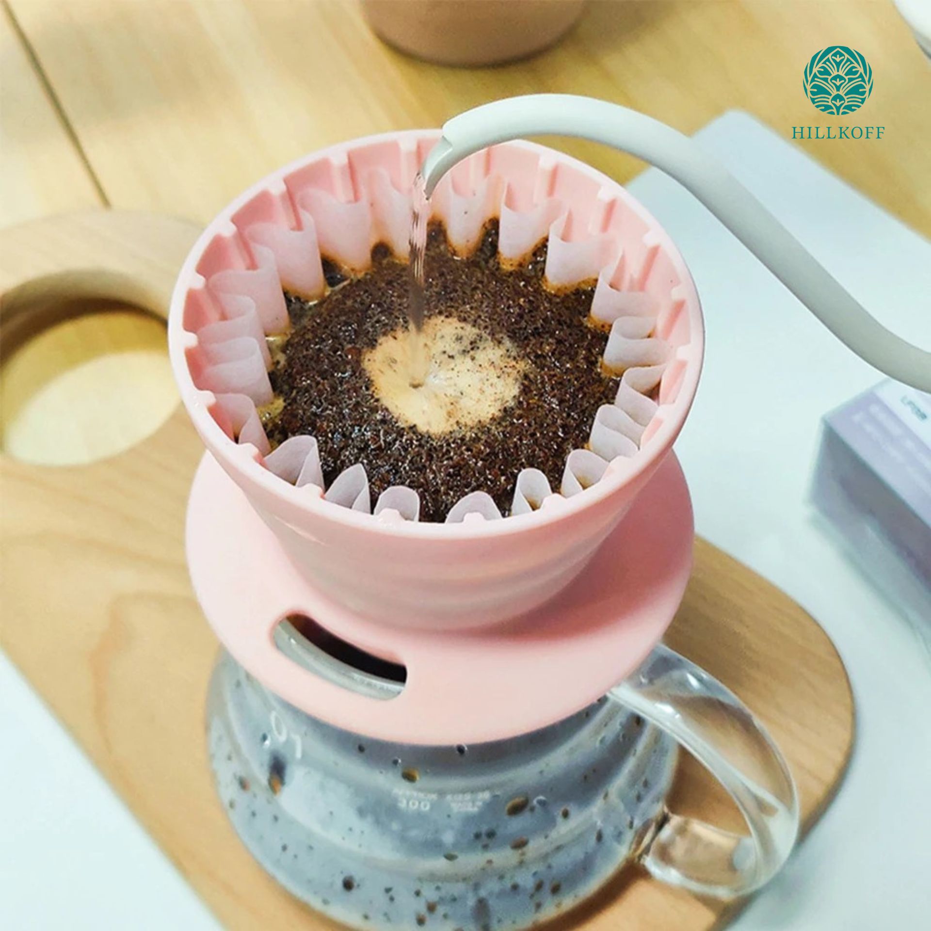 • ค่อยๆ รินน้ำร้อนเป็นวงกลมให้ทั่วกาแฟ เพื่อสกัดรสชาติอย่างสม่ำเสมอ