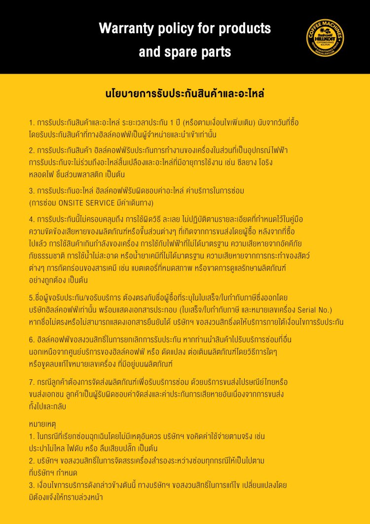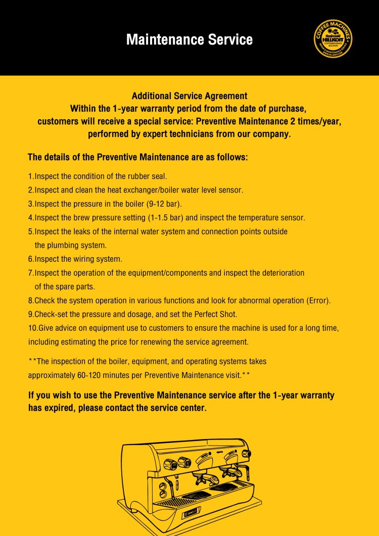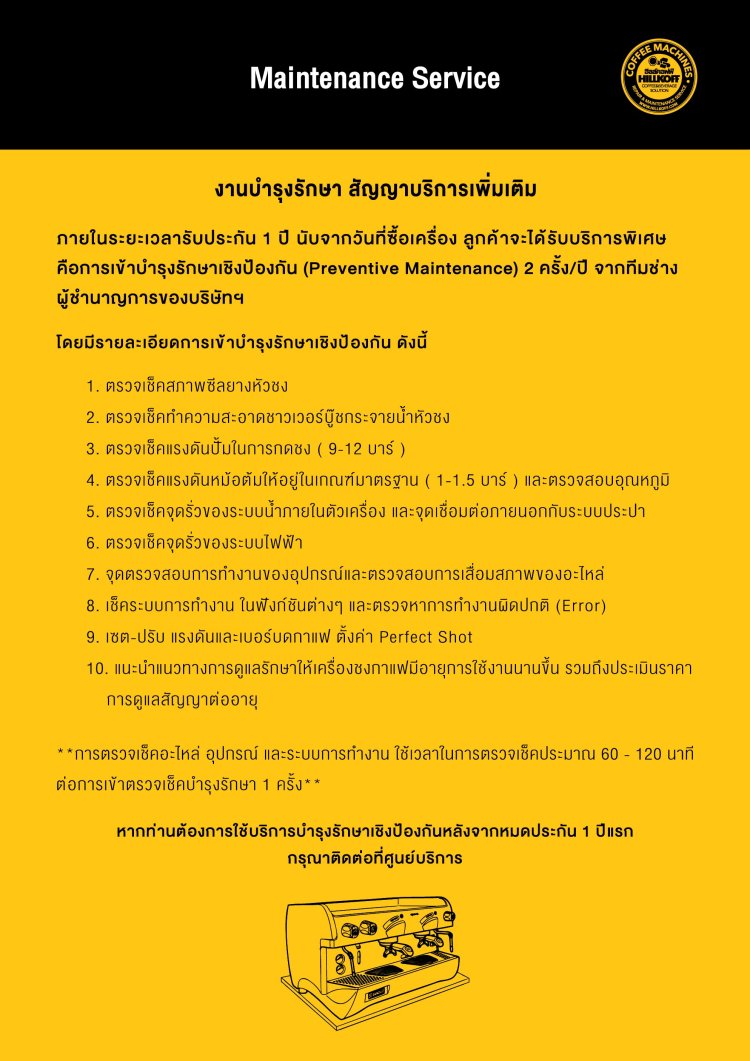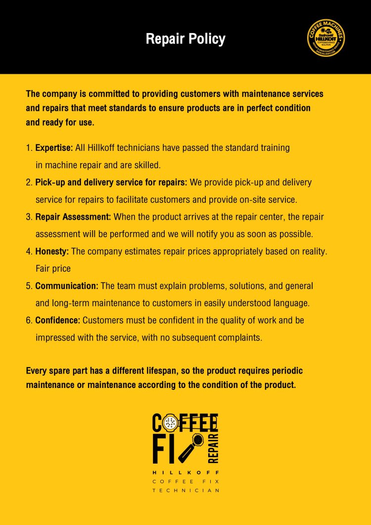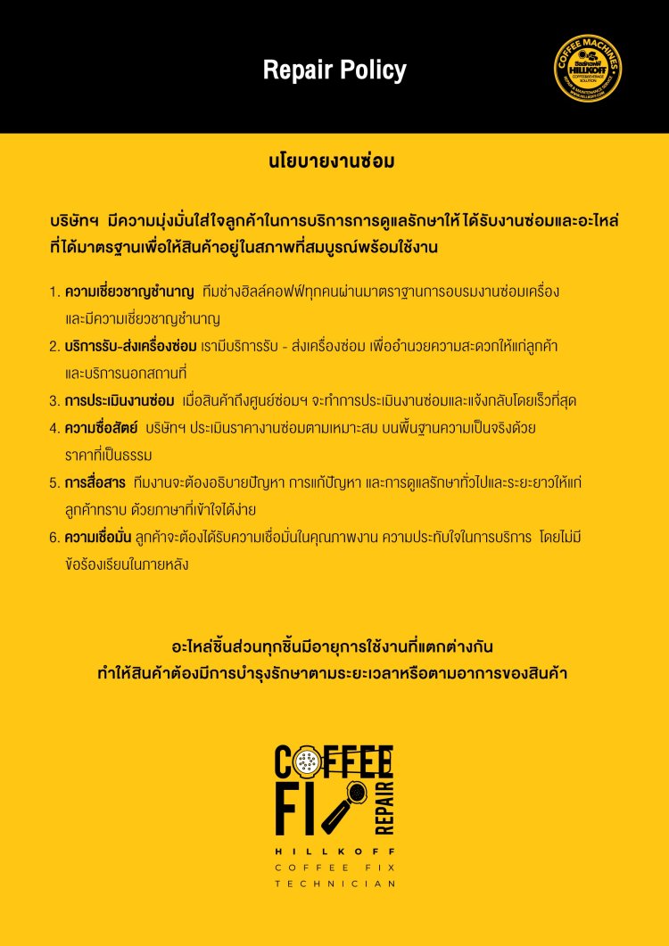 บริษัทฮิลล์คอฟฟ์มุ่งมั่นใส่ใจให้บริการดูแลรักษาอุปกรณ์ทุกการใช้งานของคุณ เพื่อให้คุณได้รับซ่อมเครื่องทำกาแฟคุณภาพ กับอะไหล่เครื่องกาแฟสำรองรองรับทุกเครื่องชงกาแฟ ให้คุณอุ่นใจด้วยช่างซ่อมเครื่องกาแฟที่ได้รับการฝึกมาจนชำนาญ ที่จะช่วยซ่อม เครื่องกาแฟสดของคุณให้สมบูรณ์พร้อมใช้งาน โดยบริการดังนี้
